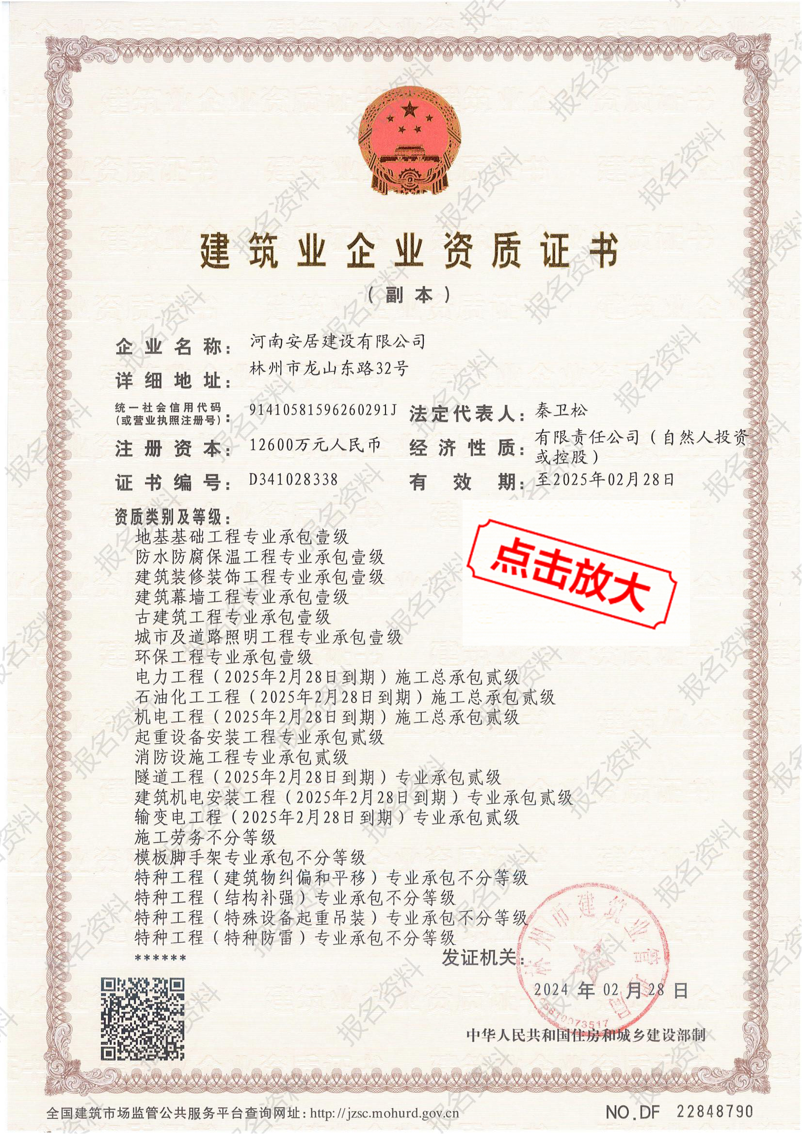 滔滔黃河哺育了中華民族拼搏向上的奮斗精神,巍巍太行造就了中原兒女的紅旗渠精神。百萬林州人下太行,鑄就了中國建筑之鄉(xiāng)響當(dāng)當(dāng)?shù)囊燮放啤:幽习簿咏ㄔO(shè)有限公司從誕生起血液里就流淌著紅色基因,秉承“安得廣夏千萬間,大庇天下寒士俱歡顏”的擔(dān)當(dāng)精神,用鋼筋混凝土筑起了高樓大廈,也用一流品質(zhì)、家國情懷打造了安居建設(shè)的輝煌成績。公司成立于2012年,注冊資金12600萬元,公司成立至今,擁有建筑,市政施工總承包等十項一級資質(zhì);其他二級等資質(zhì)共二十余項。公司秉承質(zhì)量第一,服務(wù)為主,堅持垂直管理,從不設(shè)立分公司等分支機構(gòu)。